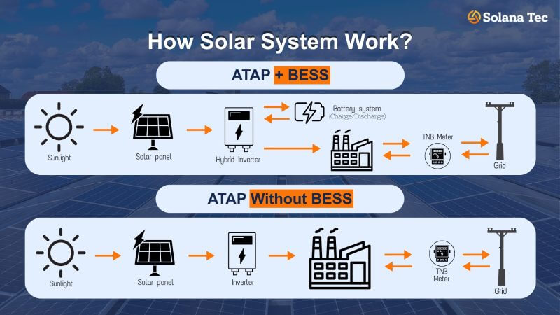 For many small and medium enterprises (SMEs) in Malaysia, adopting Solar ATAP without BESS is the most cost-effective solution. This setup powers factory operations directly during daylight hours (8 AM–6 PM), helping to reduce TNB electricity bills and achieve faster payback.